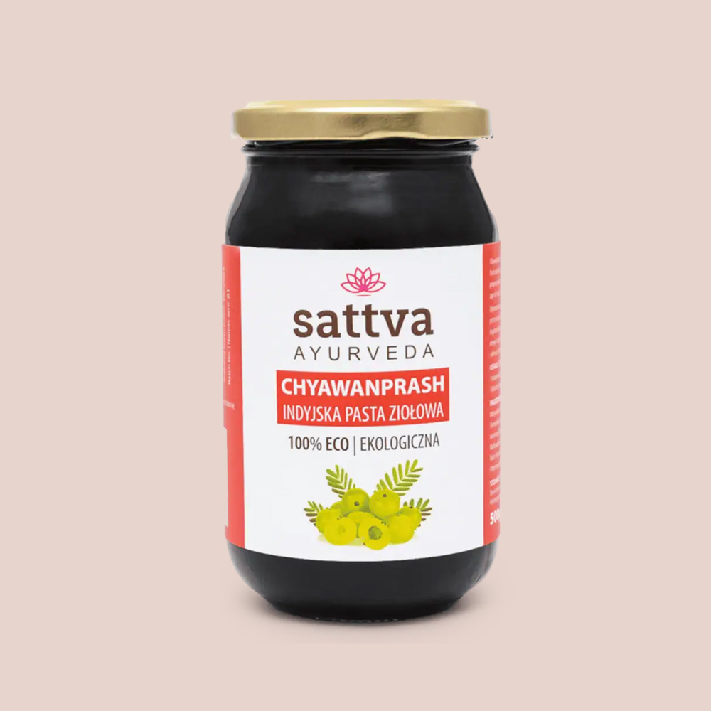 Sattva Chyawanprash to tradycyjna ajurwedyjska pasta ziołowa o konsystencji gęstego dżemu, wytwarzana według starożytnych receptur. Zawiera bogatą mieszankę naturalnych składników roślinnych, które wspierają prawidłowe funkcjonowanie organizmu, wzmacniają odporność oraz działają jako adaptogeny i antyoksydanty. Głównym składnikiem jest owoc Amli (Emblica officinalis), znany ze swoich właściwości wzmacniających i bogatego źródła witaminy C.